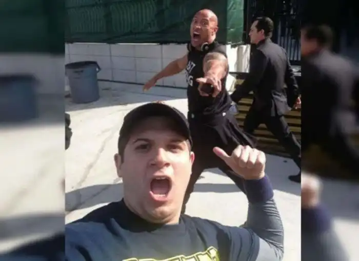 За это мгновенное фото следует благодарить мгновенную реакцию этих двух парней Дуэйна "Скалы" Джонсона и его фаната. Неизвестный поклонник Скалы, увидев его идущим по улице, успел выхватить смартфон и сделать заветное селфи с любимой звездой. Ну, а Джонсон, в свою очередь, заметив это, успел поставить поклоннику рожки и скорчить зверскую физиономию. Получилось супер!