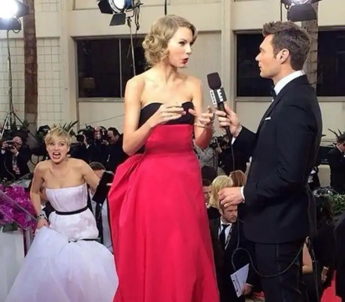 До сих пор до конца неизвестно, является ли яростное выражение лица Дженнифер Лоуренс на заднем плане шуткой, или она и вправду за что-то взъелась на Тейлор Свифт, любезничающую с телеведущим Райаном Сикрестом на церемонии вручения премии "Золотой глобус". Сама Дженнифер утверждает, что это была просто фотошутка. Что ж, поверим.