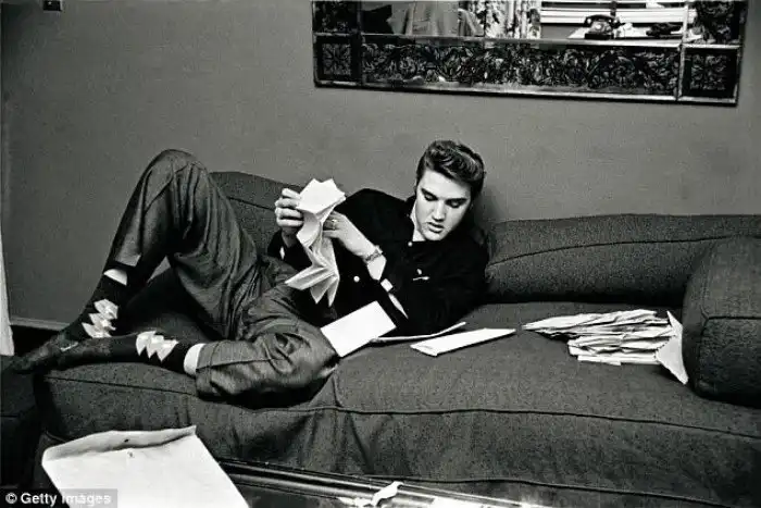 Элвис за сценой читает писма поклонников, 1957 год