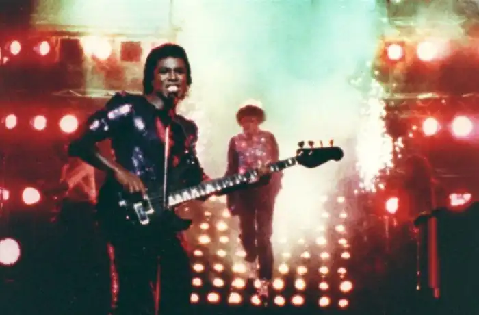 Майкл Джексон (на заднем плане) во время съемок рекламы «Пепси», когда у него загорелись волосы, а его брат Джерман (на переднем плане) продолжает выступать, не зная, что происходит. (AP)