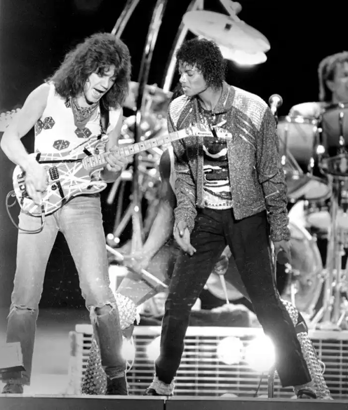 Гитарист Эдди Ван Хален исполняет соло на гитаре во время концерта Майкла Джексона в Ирвинге, штат Техас. Этот бессмертный гитарный риф был записан гитаристом специально для песни Майкла Beat It, чему совсем не обрадовался напарник Ван Халена, Дэвид Ли Рот, однако все остальные были в восторге от песни. (Carlos Osorio/AP)