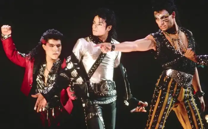 Майкл Джексон и его танцоры во время тура по раскрутке альбома Bad в Токио в 1987 году. Годом ранее Джексон снялся в научно-фантастическом музыкальном фильме «Капитан Ио» (Captain EO) в 3D, одном из самых дорогих и коротких фильмов. Джексон постепенно стал объектом для все возрастающей критики, поскольку его альбомы и клипы становились все более дорогими, но выходили все реже и реже. Его следующий альбом Dangerous вышел только в 1991 году. (Neal Preston/Corbis)