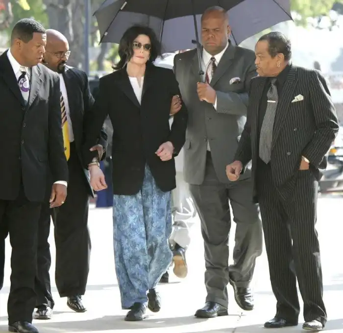 Майкл Джексон в пижамных штанах идет в сопровождении телохранителей на заседание суда 10 марта 2005 года по обвинению в растлении несовершеннолетних с 2003 года. Джексон появился на суде после того, как судья Родни Мелвил пригрозил ему отменить освобождение под залог. (Kimberly White/pool via Reuters)