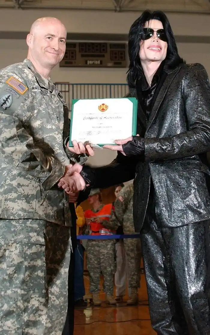 Майкл Джексон получает письменную благодарность от полковника Роберта М. Валтмеера, командующего гарнизоном Зама в Японии, 10 марта 2007 года. Майкл приветствовал тысячи американских военнослужащих и членов их семей. (U.S. Army via Getty Images)