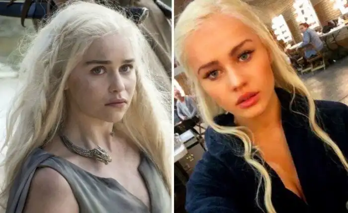 Вот это сходство! Рози Мак действительно очень похожа на актрису, исполняющую роль Дейенерис Таргариен в сериале "Игра престолов". Но, между прочим, во всех сценах, где требуется обнажиться, Эмилия снимается сама. А дублер, видимо, нужен для других эпизодов.