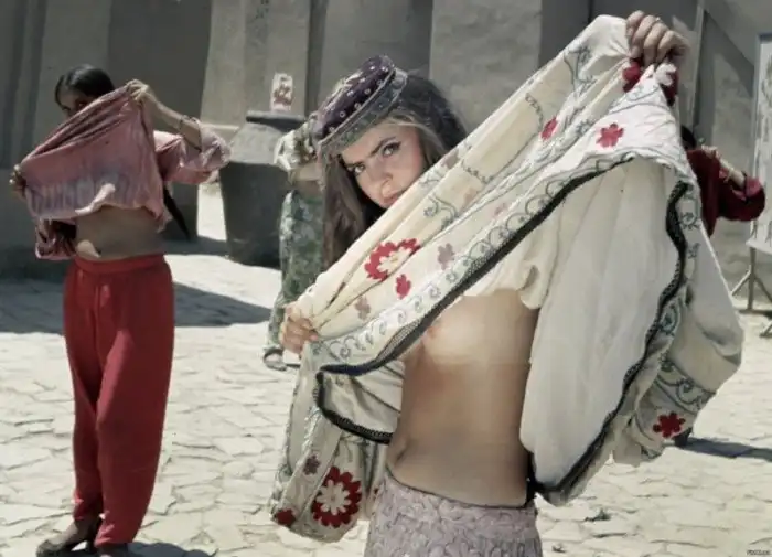 Вообще-то в роли Гюльчатай в фильме снимались две актрисы. Сначала была приглашена ученица Московского циркового училища Татьяна Денисова (и у нее на съемочной площадке возник некиношный роман с Петрухой), но вскоре ей пришлось расстаться с кино из-за экзаменов в училище. Фамилии в титрах нет, а личико сохранилось: в сцене, где Сухов сидит в окружении жен Абдуллы и незабвенной Катерины Матвевны.