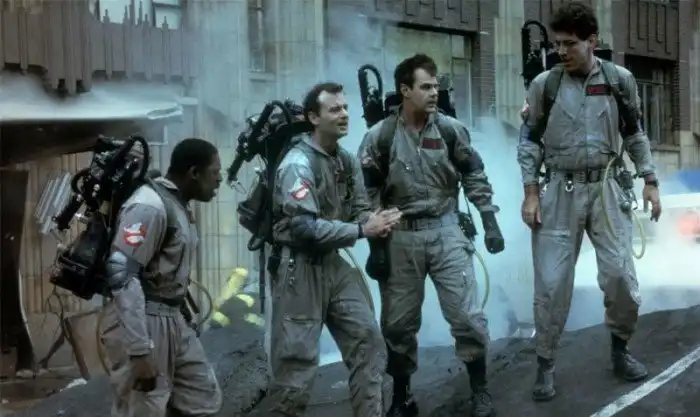 Билл Мюррей, Харольд Рамис, Рик Моранис, Энни Поттс и Дэн Эйкройд на съемках фильма, 1983 год.
