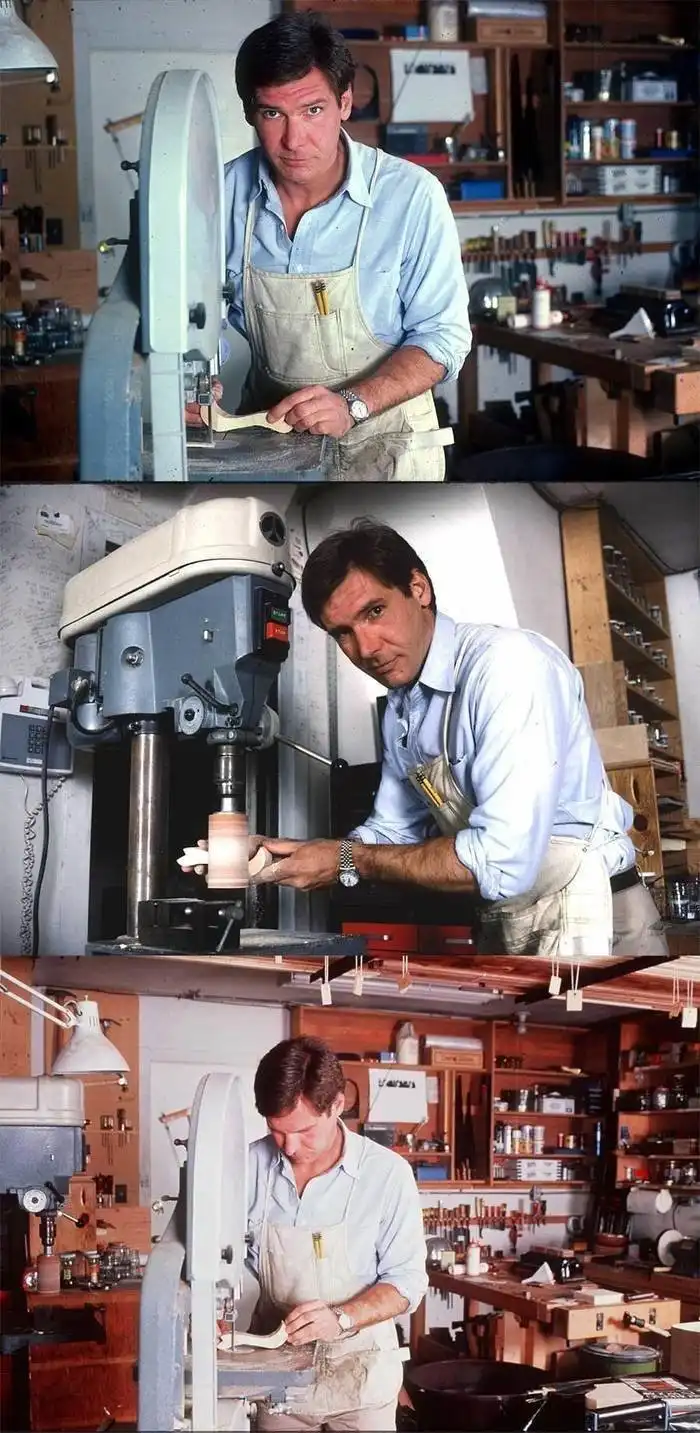Харрисон Форд демонстрирует навыки деревообработки в своём доме в Бель-Эйр, 1984 год.