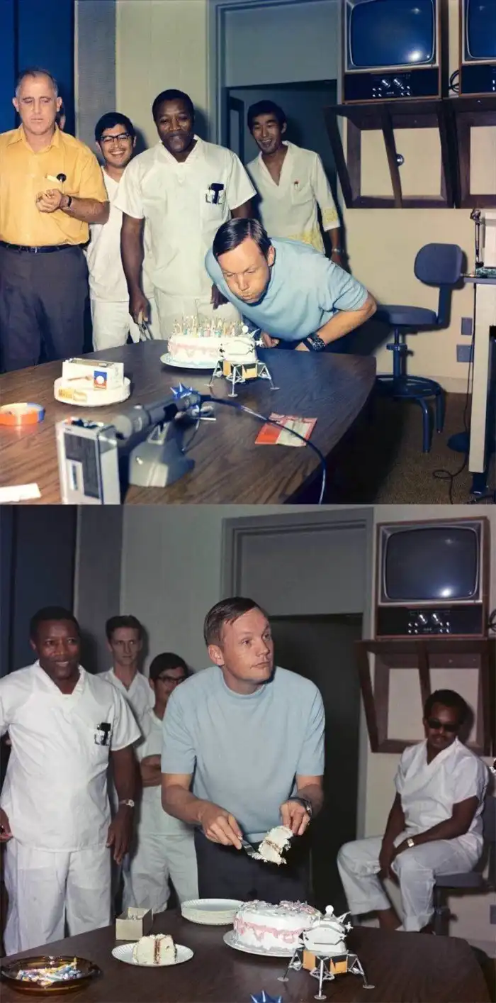 Нейл Армстронг празднует 39-й день рождения в лаборатории Lunar Receiving вскоре после миссии Аполлон-11, 5 августа 1969 года.
