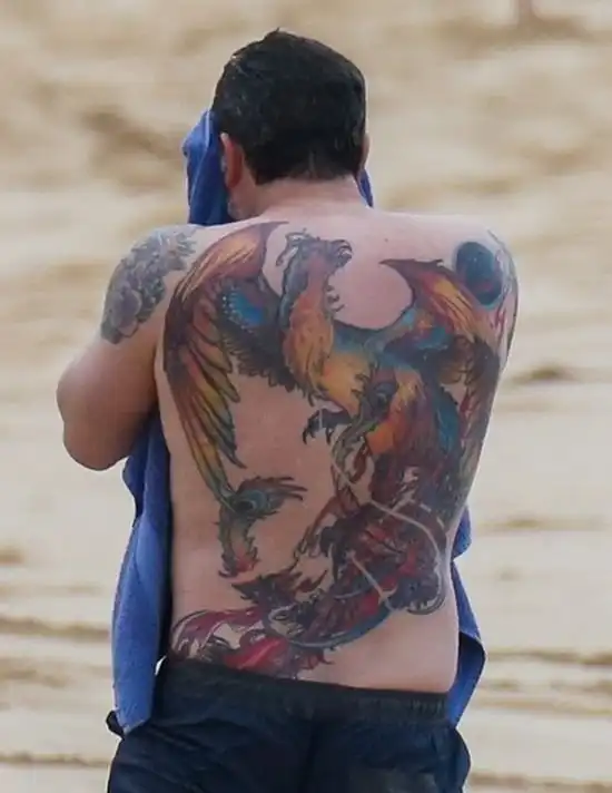 Тогда на его спине впервые была замечена огромная цветная татуировка в виде птицы феникс, возрождающейся из пламени. Актер заверил, что тату ненастоящее, но, как оказалось, он соврал. Теперь пользователи сети вновь стали шутить по поводу данной татуировки, утверждая, что это одна из самых неудачных тату, которые им приходилось видеть.