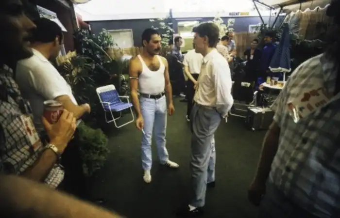 Фредди Меркьюри и Дэвид Боуи за кулисами фестиваля Live Aid, Лондон, 1985 год.