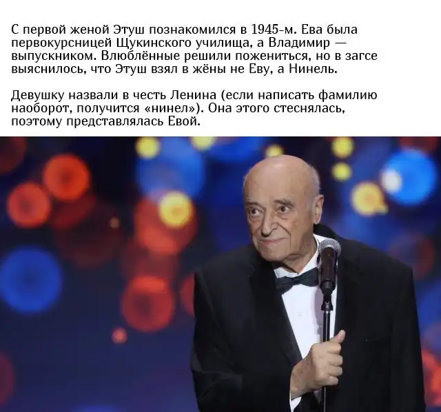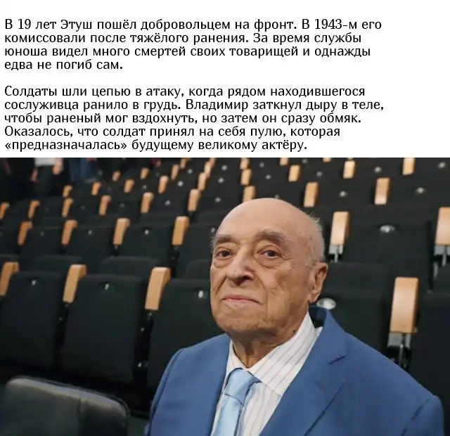 9 марта 2019 года в возрасте 96 лет умер советский и российский актёр театра и кино, театральный педагог и профессор Владимир Этуш. Актер работал в театре имени Евгения Вахтангова с 1945 года, а также сыграл более 80 ролей в кино. Антон Семёнович Шпак, товарищ Саахов, Карабас-Барабас - все эти роли навсегда останутся в памяти многих поколений зрителей. Читаем далее малоизвестные факты из биографии и личной жизни Владимира Этуша.