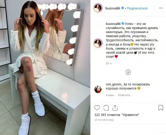 33-летняя телеведущая Ольга Бузова не перестает удивлять своими публикациями в социальных сетях. На этот раз она опубликовала фотографию с разбитыми коленками. Стоит отметить и то, что всего два дня она писала, что сильно разочаровалась в мужчинах. Совпадение или нет? Конечно же, такую фотографию она снабдила "философской подписью" про успех и пути его достижения.