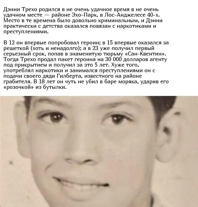 На днях одному из самых известных актеров трэш-кинематографа Дэнни Трехо исполнилось 75 лет. Хоть многим из нас он известен лишь только благодаря роли в серии фильмов "Мачете", в его биографии было довольно много интересных и действительно поразительных фактов. Предлагаю вам почитать историю его жизни в продолжении поста.