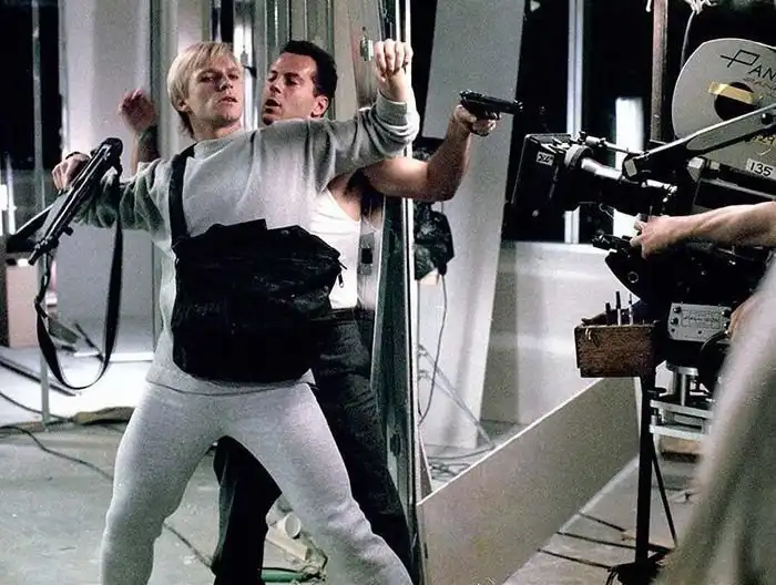 Брюс Уиллис и Андреас Висневски на съёмках "Крепкий орешек"(1988).