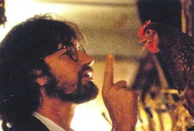 Стивен Спилберг инструктирует курицу на съёмках "Индиана Джонс и Храм судьбы"(1984).