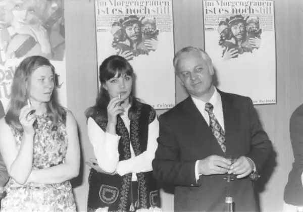 Актрисы Людмила Зайцева, Ольга Остроумова и режиссер Станислав Ростоцкий на премьере "А зори здесь тихие" в Берлине, 1972 год