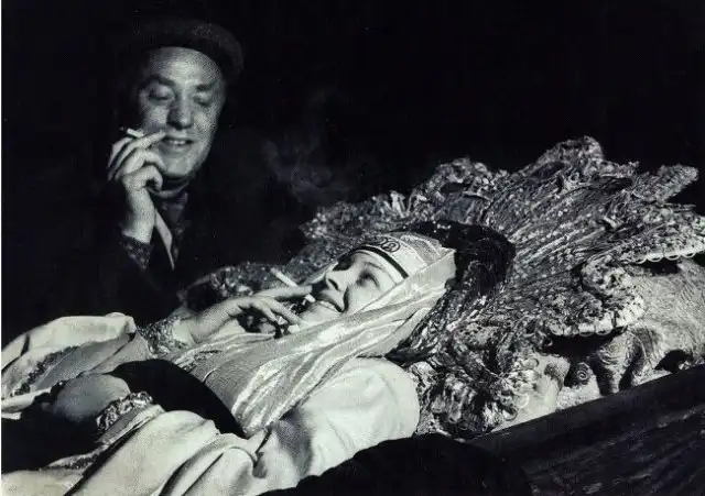 17. Людмила Целиковская и Михаил Жаров в перерыве между съемками эпизода смерти царицы Анастасии в картине Эйзенштейна «Иван Грозный», 1944 год
