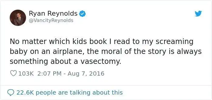 "Какую бы книжку я ни читал в самолете своему орущему ребенку, в ее морали всегда находится мысль о вазэктомии".