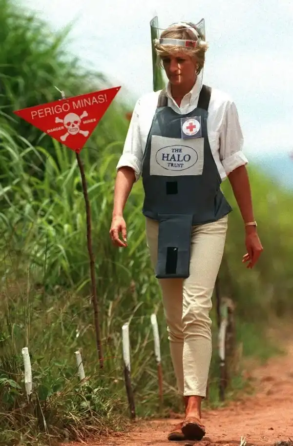 В одном из городов Анголы за несколько дней до приезда принцессы на поле, не разминированном полностью, подорвались подростки, играющие в футбол. Именно по такому полю прошла леди Диана, надев на себя бронежилет и защитную маску от пуль, — так она выступила в поддержку движения против противопехотных мин.
