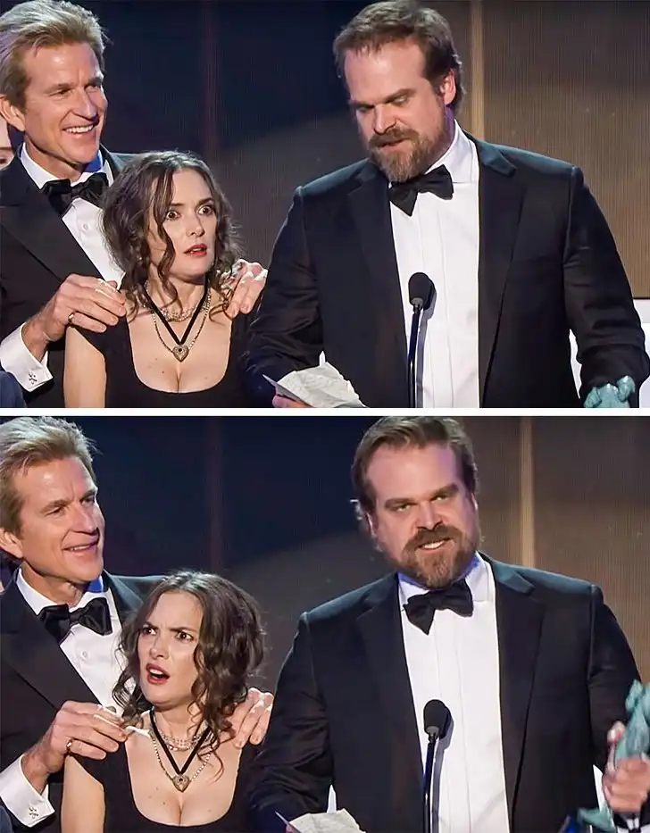 Команда сериала «Очень странные дела» в 2017 году получила премию от Гильдии киноактеров США в номинации «Лучший актерский состав в драматическом сериале». Все участники награждения просто кипели от эмоций, но настоящий фурор произвела именно Райдер. За все время, которое ее коллега Дэвид Харбор произносил речь, актриса странным образом постоянно менялась в лице. Эту карусель эмоций пользователи сети посчитали лучшим событием премии и расхватали по кускам на гифки и фотожабы.