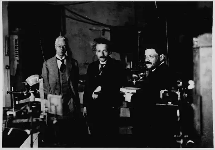 Эйнштейн в лаборатории Питера Зеемана (слева), Амстердам, 1920.