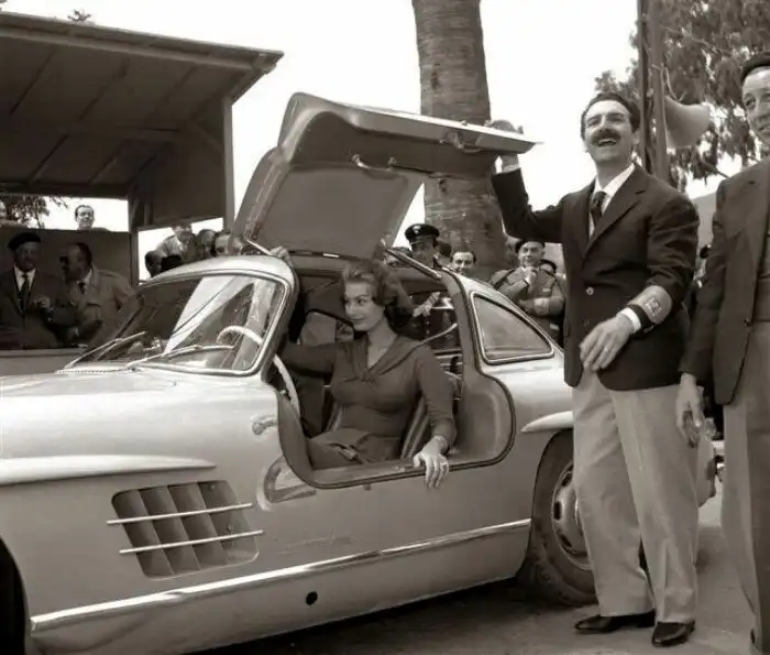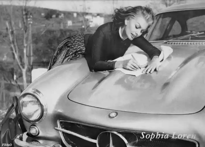 Mercedes-Benz 300SL - спортивный автомобиль, выпущенный в 1954 году в двухместном кузове купе с уникальными дверями типа "Крыло чайки", и вдохновленный гоночным авто W194. На этих ретро-фото легендарная Софи Лорен позирует со своим недавно выпущенным 300SL в Риме.