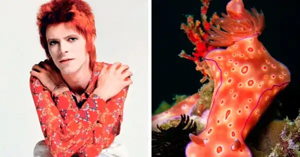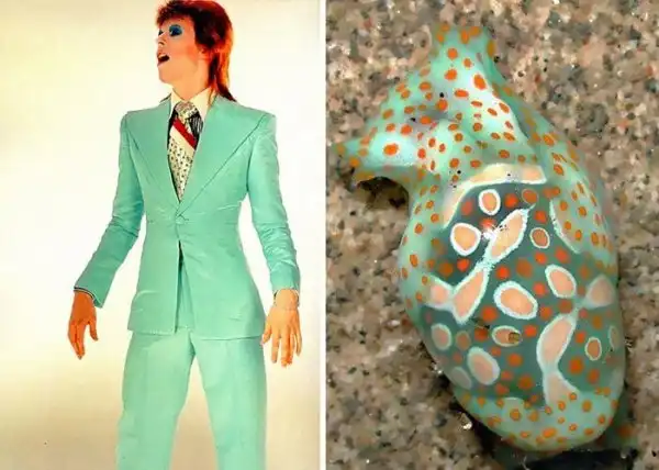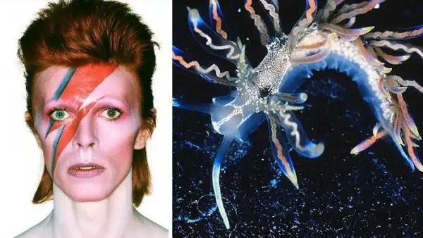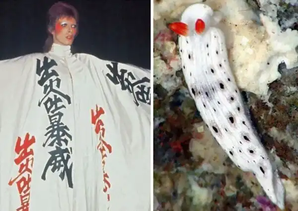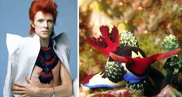 Невероятные образы, которые десятилетиями создавал Дэвид Боуи, имеют необъяснимое и невероятное сходство по узорам, расцветке и форме с морскими слизнями. Об этом заявляют члены группы "Bowiebranchia" во главе с нью-йорским дизайнером Трейси Денди. Они не жалеют времени и сил, собирая фотодоказательства родства Боуи с этими необычными и чрезвычайно разнообразными моллюсками.