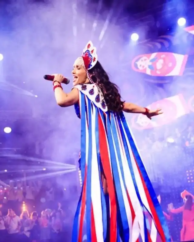 А на концертах надевает наряды, раскрашенные в цвета российского триколора.