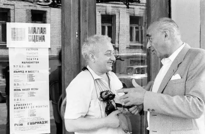 Главный режиссер Тбилисского театра марионеток Резо Габриадзе беседует с артистом столичного театра им. Вахтангова Владимиром Этушем