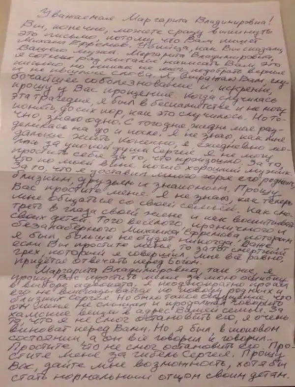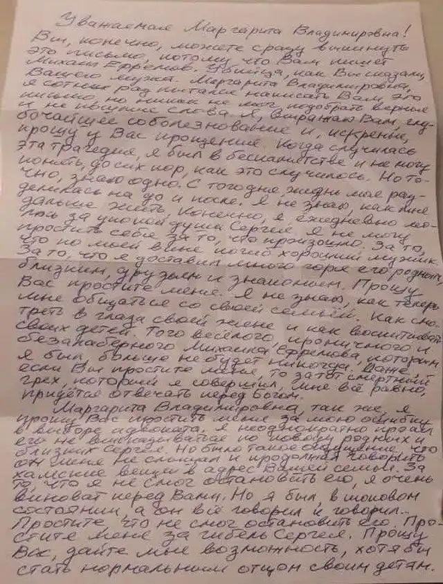 Актер отбывает наказание, но, как он сам несколько раз признавался, тяжело переживает содеянное. Он решил изложить свои мысли на бумаге и попросил отправить их семье погибшего Захарова. Адвокат потерпевших уже заявил: "Это те слова, которые нужно было говорить изначально".