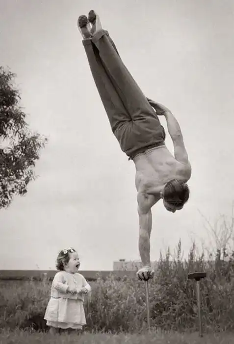 26. "Самый лучший зритель" папа показывает маленькой дочери свое умение стоять на руке, Австралия, 1940 год