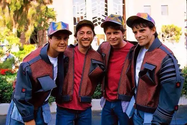 Майкл Джей Фокс со своими дублёрами на съёмках фильма “Назад в будущее 2”, 1989 год.