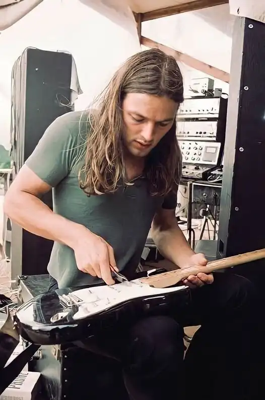 16. Дэвид Гилмор работает над своим легендарным черным стратокастером в 70-х годах