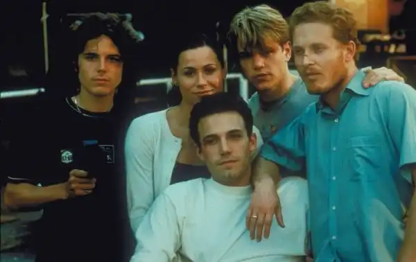 Кейси Аффлек, Минни Драйвер, Мэтт Деймон, Бен Аффлек и Коул Хаузер на съемках фильма «Умница Уилл Хантинг» в 1997 году