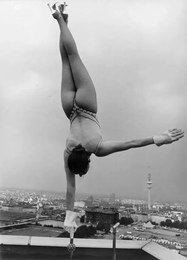 27. Цирковая артистка Сильвия Терон на крыше небоскреба в Гамбурге. Германия, 1970 год