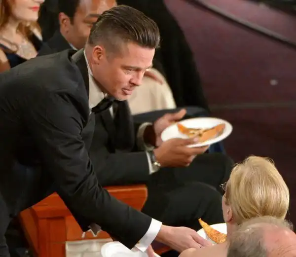 Брэд Питт предлагает кусочек пиццы Мерил Стрип на церемонии 2014 года. Идея накормить проголодавшихся звезд пришла в голову ведущей Эллен Дедженерес