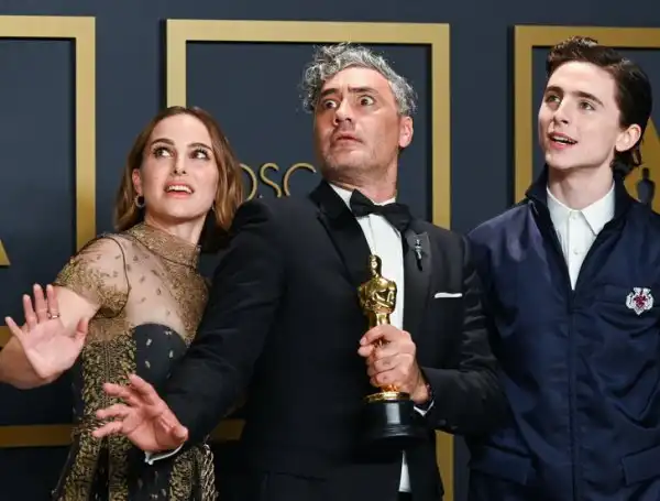 Тайка Вайтити, получивший свой первый «Оскар» за лучший адаптированный сценарий, позирует фотографам вместе с Натали Портман и Тимоти Шаламе