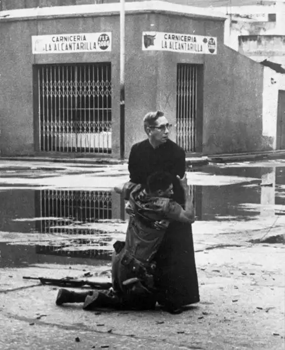 13. вященник держит в руках умирающего солдата, сраженного пулей снайпера. Автор - Эктор Рондон, священник - Луис Падильо, Венесуэла, 1962 год