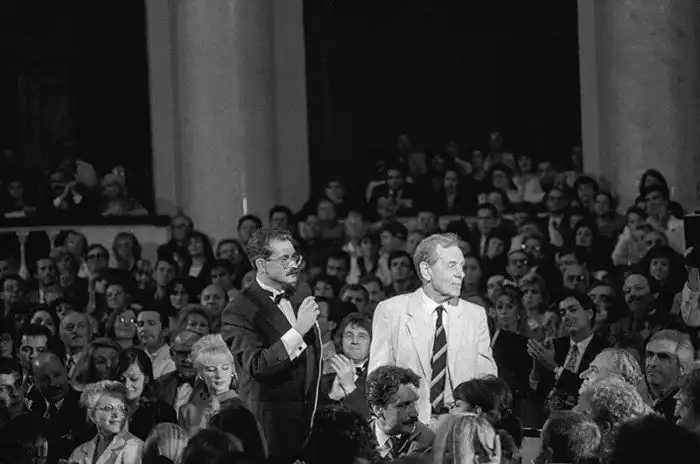 13. Владислав Листьев и Георгий Жжёнов во время открытия фестиваля «Кинотавр", 1993 год.