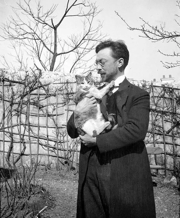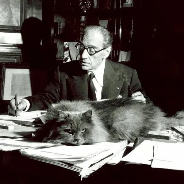Писатель и режиссёр Саша Гитри помогает коту в его рабочих делах, 1955 год