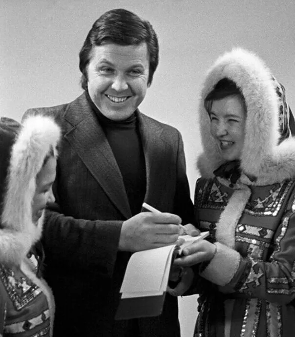 18. Лев Лещенко дает автограф участницам ненецкого национального ансамбля танца "Сыра-Сэв". 9 ноября 1978 год
