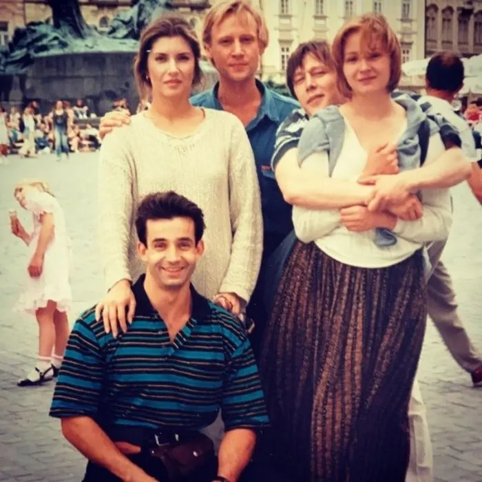 35. «Прага, 1993 г., съемки сериала "Королева Марго". Вера Сотникова, Дима Харатьян, Миша Ефремов, Женя Добровольская сфотографировались с туристом из Москвы», — иронично подписал кадр Певцов