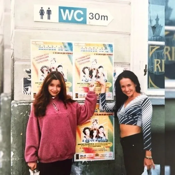 4. Ольга Орлова и Жанна Фриске на фоне плакатов группы "Блестящие", 1997 год