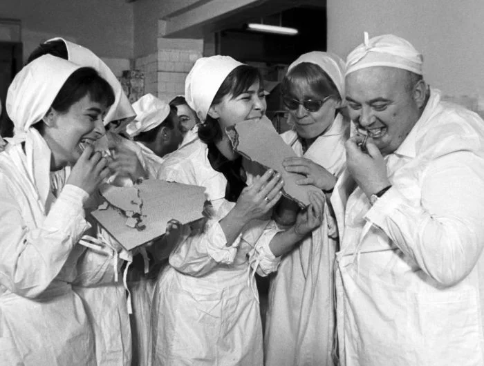 37. Евгений Моргунов и Лариса Голубкина на кондитерской фабрике «Большевик», 1985 год