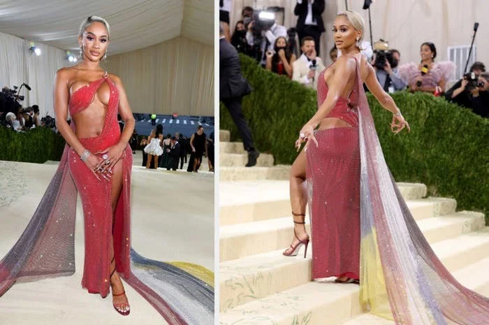 2. Певица Saweetie в платье с цветами американского флага и цветами филиппинского флага с разных сторон