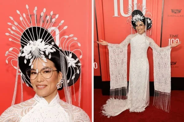 Актриса надела аоай (традиционное вьетнамское платье), и головной убор, представляющий вьетнамскую культуру.