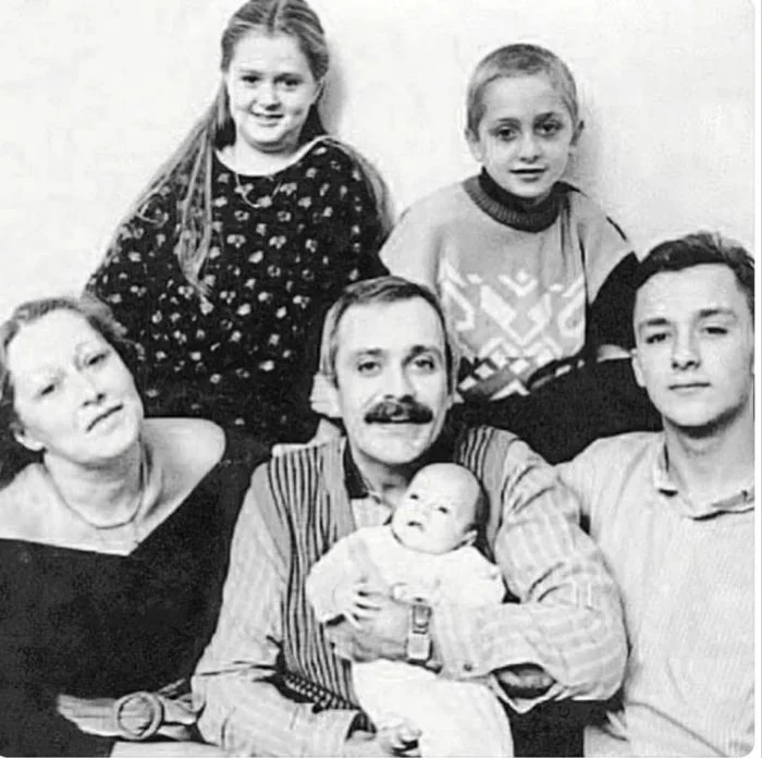 38. Никита Михалков с женой Татьяной и детьми: справа на фото сидит Степан, сын от первого брака, на руках маленькая Надя, а за спиной Анна и Артём, 1986 год.