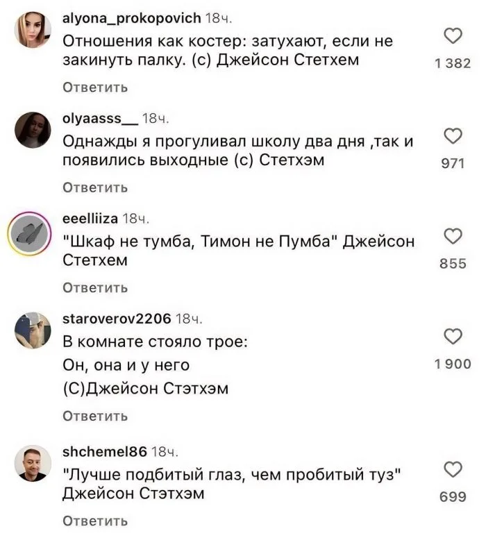 Вряд ли Джейсон Стейтем представлял, когда создавал свой аккаунт в Инстаграм, что он станет таким клубом для русскоязычных поклонников. Конечно, в комментариях можно встретить фанатов актера со всего мира, но наших там настолько много, что остальные по сравнению с ними кажутся незаметными.