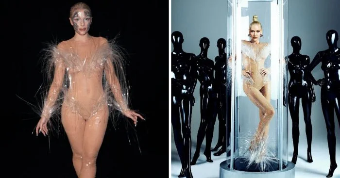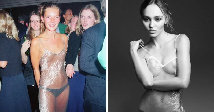 Молодая модель решила повторить легендарный образ модели старшего поколения в маленьком прозрачном платье.